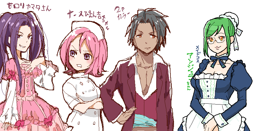 2016/10/26 Category : 未分類 絵チャと 平田さんとの絵チャとTwitterにあげたらくがきです。絵チャしたのは約ひと月前で、何故か投稿した気になっていて今更ですが(; ・`ω・´)お互いに相手のキャラにコスプレさせて描くといった感じ。平田さんの描いてくれた、甘ロリカマタは平田さんの絵だから見られますけど、私が描いたらペン折れちゃう位の甘さとドヤ顔(笑)ナースぴょん吉は、昼間は看護師してて夜はスナックでバイトしる設定デフォだったかな?と思いわせる位似合ってますね(●´ω`●)毎度おなじみ、私の描くスピードが遅くて空いた時間に平田さんが追加で何か描いてくれるシリーズ(シリーズ?)2Pカラーのエヴァンさんも勿論カッコイイけど、元のエヴァンさんの方がやっぱり好きだなぁ。ちなみに私が描いたのは右端の平田さんちのアンジェラちゃん@メイドコス。スタイルがぼいーんばいーーんで私好みで、メガネっ娘なのがまたぐっときます! 続きはこちら