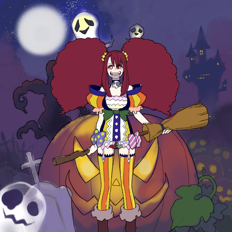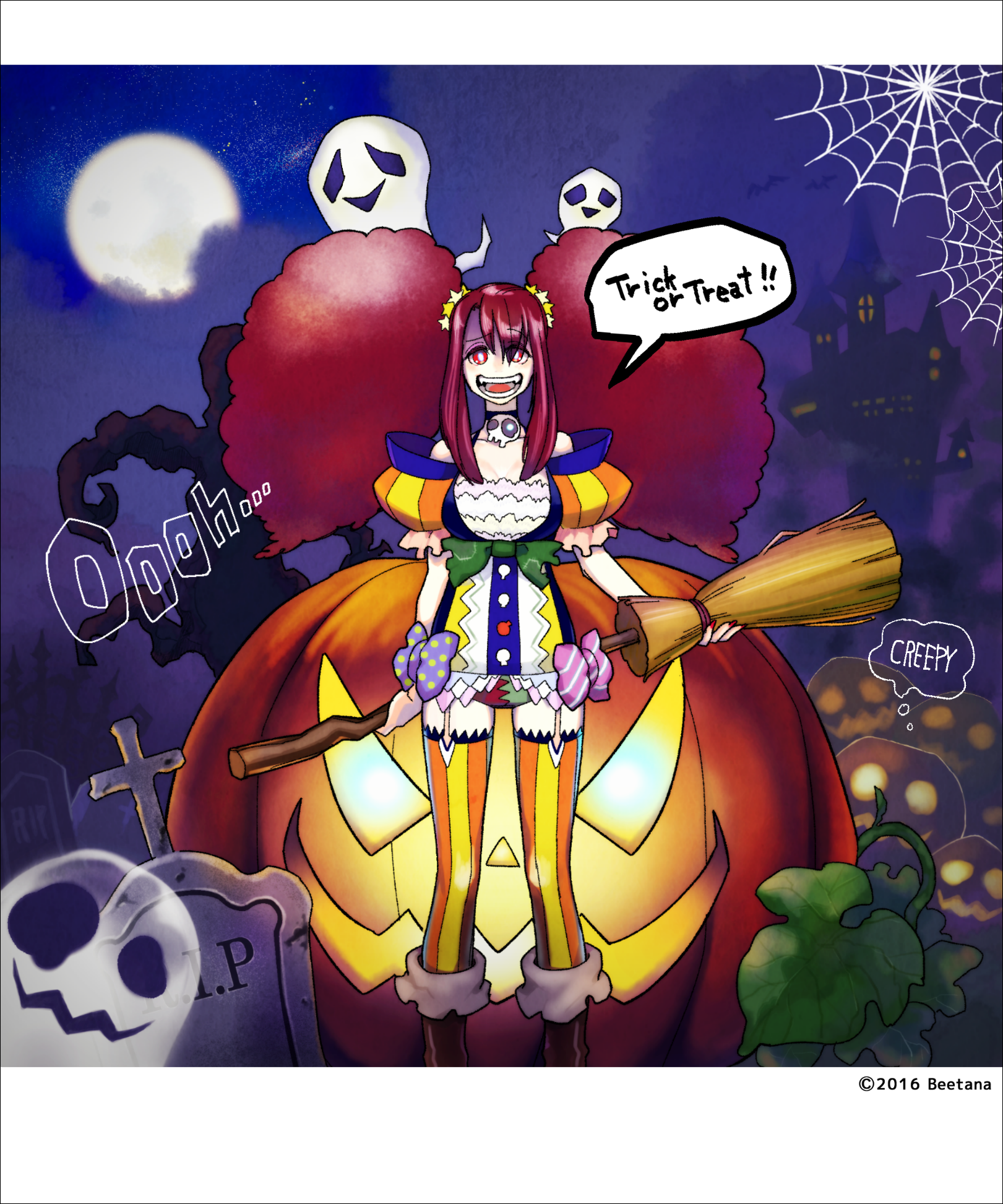 2016/11/14 Category : 未分類 ハロウィンイラスト 今更のハロウィンイラスト魔女はもじゃもじゃしてて欲しいみたいなところから描きはじめました。特に設定のあるキャラではなく、だからこそ自由に描けるのが良くて何か楽しかったです。今回はちょっと制作の流れを簡単に紹介してみたいと思います。「誰が興味あんねん!」とヤ●ギブ●ンさんにツッコまれそうですが…。元々は、前回の記事に載せてたらくがきがベースでそれをラフ案として使いました。やっぱりもじゃもじゃがいいね~と思いながら適当に描いてます。下描き、ペン入れ、仮配色時点ラフにあったミニ帽子は無くして星の髪留めをアクセントに。仮配色の時はちょっと南瓜がうすぐらく光っていて、遠くにあるならそれで良いんですが、キャラと近いとこにいたので、発光強めてメイン感出してみましたが…今更ですが、キャラクターは逆光感もっと出した方が良かったのかも?特に下半身とか。これで一応完成だったんですが、見てると物足りなくなってきて吹き出しやら蜘蛛の巣やら加えて↑になりました。