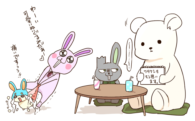 2014/07/12 Category : 未分類 乱々臨々とミリアちゃんシロクマ君 平田さんが、描いてくれました!!ヽ(=´▽`=)ノそれにしても、同じウサミミだからと言って、乱々に近づくのは大変危険です。行動に意図や脈絡があるのか無いのか、仲良くなったかと思ったら次の瞬間逆の行動を取るとか、まともな感情を持ち合わせているかも分かりません(笑)そんな乱々に近づいたミリアちゃんの運命やいかに・・・。かたや、臨々と紀ノ定さんちのシロクマ君。ほのぼの会話してる様に見えますが、臨々は声が小さくて何を言ってるのか誰にも聞き取れないので、シロクマ君の回答は適当みたいです(笑)平田さん、可愛いくて面白いイラストありがとうございましたー!ちなみに乱々臨々は男で、乱々は耳無しで130㎝、臨々は60㎝位です。
