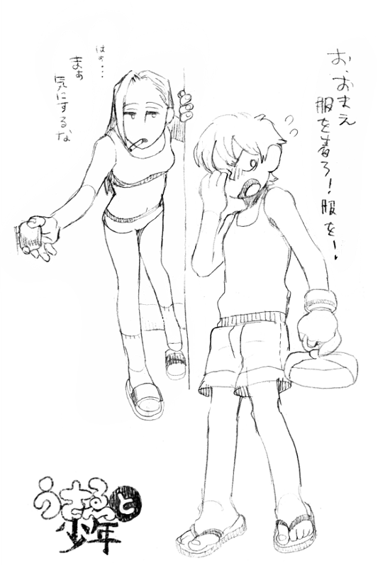 2014/03/23 Category : 未分類 うさゑと少年 うさゑとアパートの隣に住む少年。少年:「ったく。母ちゃんも弁当なんて自分で持って行けよな・・・」ピンポーンガチャ少年:ギョッ少年:「お、お前!服を着ろ!服を~~!」うさゑ「は?・・・あぁ、まぁ気にするな。」少年:「お前が気にしろ!」といった話。
