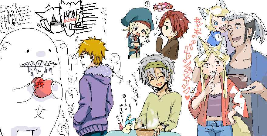 2014/02/13 Category : 絵チャ 絵チャ 相変わらずお題が決まらない我々の絵チャでした(笑)決まったお題はバレンタイン(言われるまで頭にも無かったぜ・・・。)左から、もりやま氏。造利(つくり)君にバレンタインチョコを貰う女(女というもりやま氏のキャラ)と、賑やかしのOKAO星人(笑)あぁ!!上ではロク君がコウちゃんに愛の突撃をうけている!これもひとつのバレンタインのカタチなのか・・・。平田さん。ミリアちゃんをチョコ風呂に誘い込んで食べようとするシャス君。(|| ゚Д゚) 逃げてー!!しかし、後ろで船長さんが気づいてくれたので、恐らく大丈夫 ε-(・∀・;)エヴァンさんはチョコいっぱいもらって、オコボレに預かるOKAO星人もいるよ。私は狐一家で、太郎と金太郎から凛へチョコケーキ。ホワイトデーも太郎と金太郎から貰える凛。甘いものはそんなに食べないので、残すけど。凛は人に何かを与える事があるんだろうか・・・。いいとこあるんだろうか・・・。