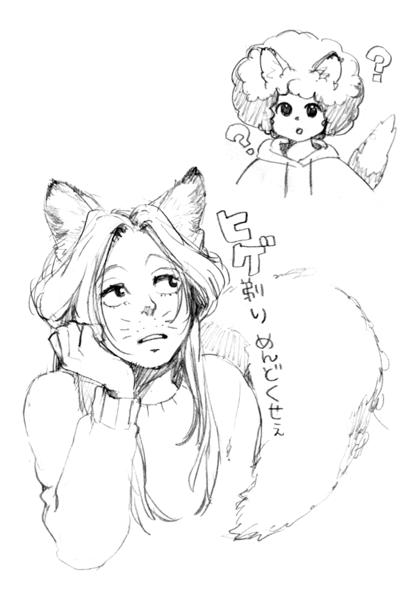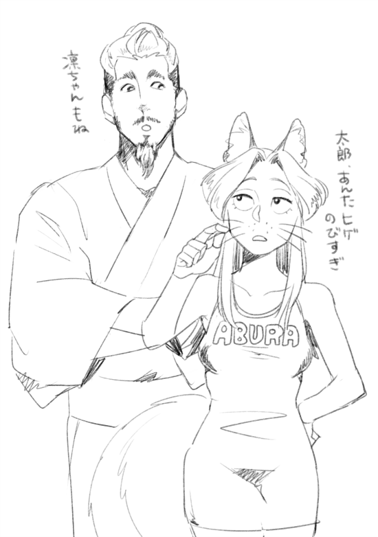 2013/12/06 Category : 未分類 ヒゲの夫婦 ネーム煮詰まってますけど、なんとか進んでます(笑)ヒゲの夫婦描いてる場合じゃない・・・。実はネームより『よすが町の人びと』の風景を描きたいんですが、何しろ同時にモンハンも頑張らないといけないので、時間が無い!(笑)モンハンに飽きるか、ネームが終われば良いだけの話。あ、HR開放されました。ソロはキツイっすね・・・。そして、しれっと『創作1』に『よすが町の人びと』とタイトルつけてました。割りと平仮名が好きなのでこんな表記ですが、漢字だと『縁町の人々』という風になります。
