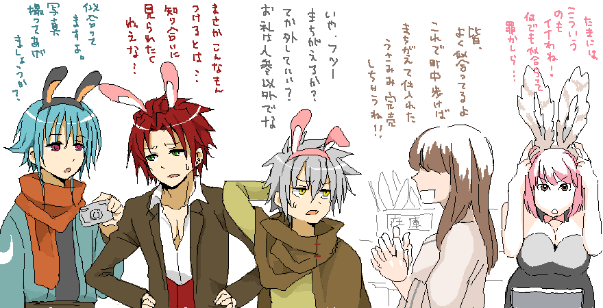 2013/05/31 Category : 絵チャ 5月30日絵茶ログ 平田さんと絵チャ~ヽ(=´▽`=)ノ【在庫処分を手伝わされる3人と、うさ耳物色中のぴょん吉】の図。どこかで見た光景ですが・・・(゚∀゚)毎度イイようにカプリスに使われてしまうラルフ君に、エヴァンさんと時人様が加わって完璧の宣伝媒体ですね!!ラルフくんへの謝礼は人参・・・。エヴァンさんの言う知り合いはピンポイントであの方だろうな?シ○スくん。「時人様!!写真の焼き増しはどこに申しこめばいいのでしょうか!?(*´Д`)/」ぴょん吉は安定の自信過剰_:(´ཀ`」 ∠):_ おにゃのこだから許すけどさ・・・。平田さん!漫画製作時間割いて、絵チャお付き合いありがとうございました~~!その後しっかり漫画も投稿されてて、ダブルでおいCかったですヽ( ´∀`)ノ 追記は絵チャらくがき