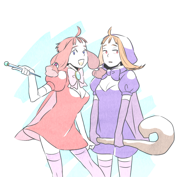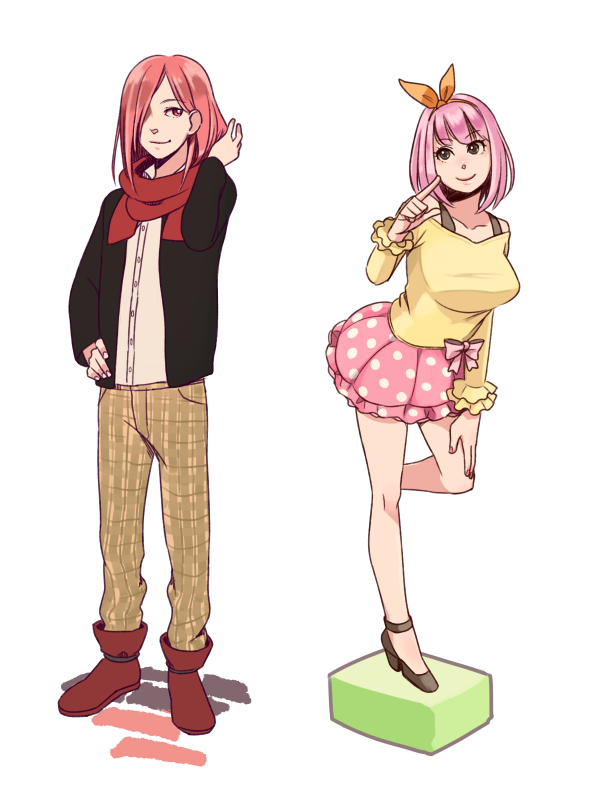 2013/04/20 Category : 未分類 着せ替え 以前、平田さんに考えてもらったリンゴとぴょん吉の衣装で描いてみました。自分で描いてみて、ぴょん吉は水玉スカートで若作りしてる感じがキャラと合っていて、私の拙いキャラ紹介から特徴を読み取って頂けた気がしてます(笑)そして、リンゴは普段女装で赤いワンピースを着ていますが、この服は渋めな色と女装じゃないところでギャップを楽しんで描きました( ´∀`) チェックのパンツがお気に入り。リンゴの顔が優しくなってしまったのは、新しい衣装を考えてもらった私の喜びの現われという言い訳をしておきます。平田さんが描いてくれたイラストはコチラ。