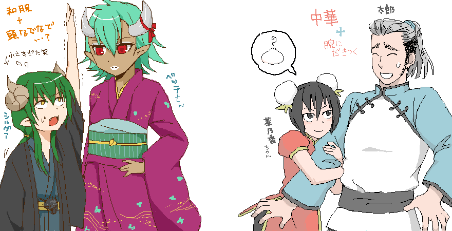 2013/04/08 Category : 絵チャ 絵チャ 先週の金曜日は平田さんとSkype絵チャしてました。今回の絵チャの内容は『自分のキャラと相手のキャラを指定の衣装とシチュエーションで描く』〈指定〉には、毎度お世話になりますの阿弥陀さまです。平田さん:和風な衣装でシルヴァさんと(beetanaのキャラ)、頭ナデナデ。beetana:中華な衣装で太郎と(平田さんのキャラ)、腕に抱きつく。一緒に描く相手のキャラは内緒にするというお楽しみ要素付きです。阿弥陀さまに従い黙々と描いてるとほぼ毎回、私が工程ひとつ分遅れて平田さんを待たせてしまうんですよね(;´∀`)それでもSkype通話しながらだと、平田さん描き終わったな?と思ったら自分の手を動かしつつ会話もできるので、待たせてる側のプレッシャーはチャット時代とくらべて激減です(笑)ただ、今のところ待ってる側になったことがないのでなんとも言えませんが、平田さんが「大丈夫ですよ~」と言ってくれるので思いっきり甘えてます(*ノω・*)テヘ待たせに待たせて出来たのがコチラ。 平田さんは、ベッテの頭を撫でようとしてるシルヴァさん。シルヴァさんも背高いんですけど、ベッテは2Mもあるので中々届かないようです(笑)澄ましてないでしゃがんであげて!!私は、太郎に豚まんねだる菜乃香ちゃん。腕に胸を押し付けておねだりしているんでしょうか(笑)しかし菜乃香ちゃん豚まん一個で済むと思えません。太郎・・・ガンバレ!絵チャの後は平田さんのキャラにあう声優さんを探すという遊びをしました。お互いあまり声優さんに詳しくない感じでネタ切れ必死でしたが、とても楽しかったです。
